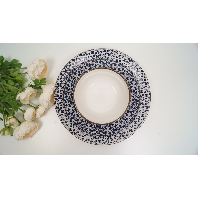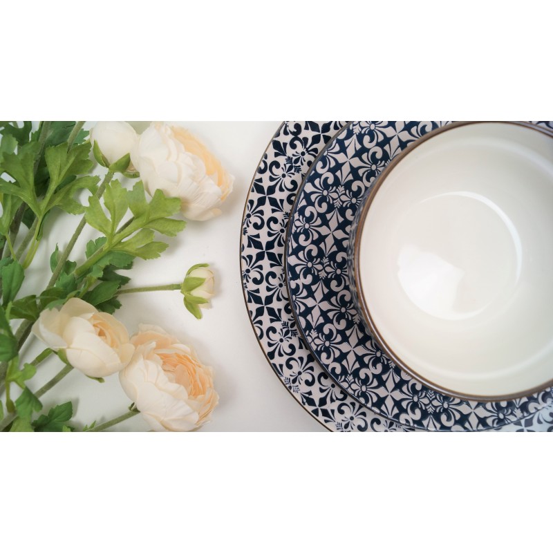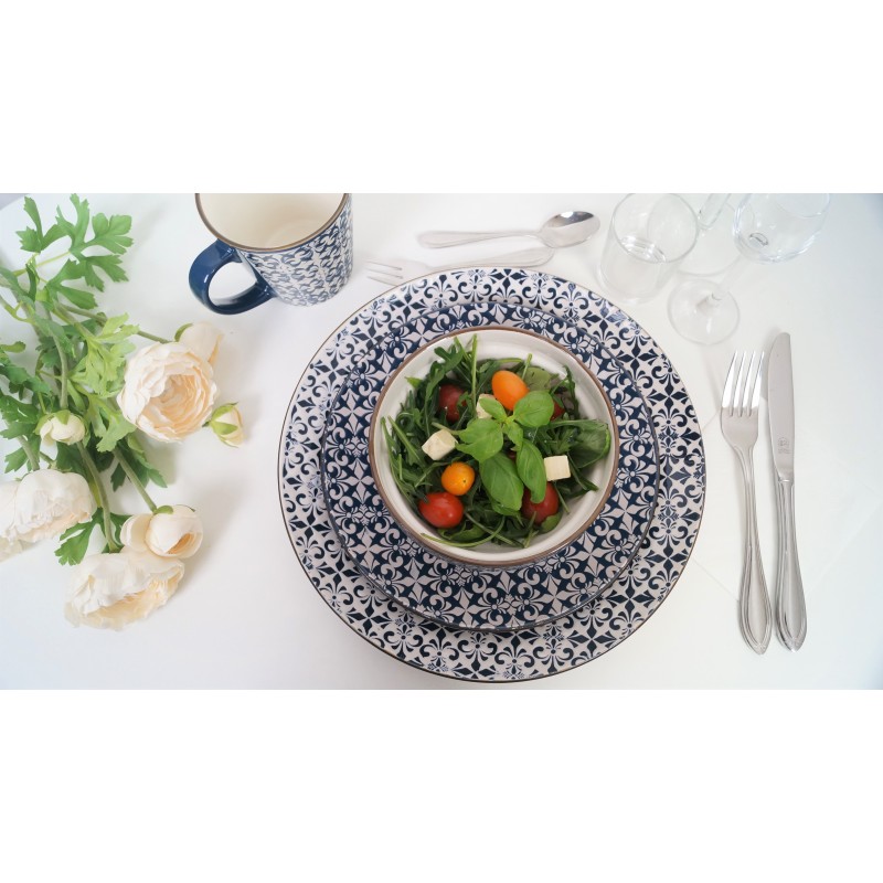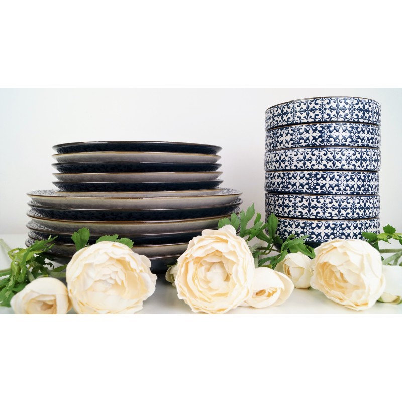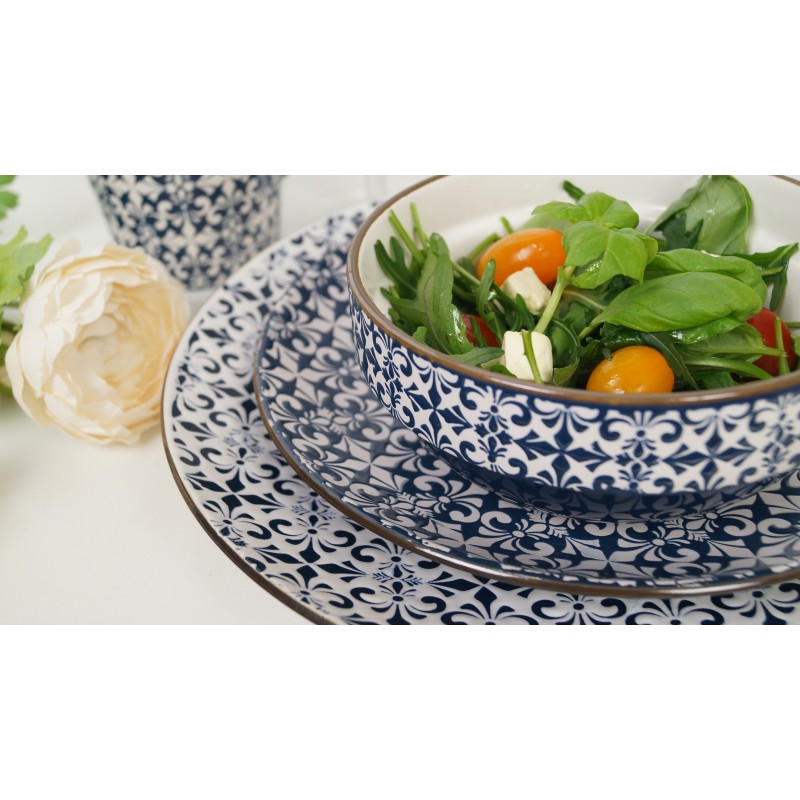 Stylish blue and white 18-piece dinner set. It's the perfect addition to your favourite meals. It's also dishwasher and microwave safe for added convenience.