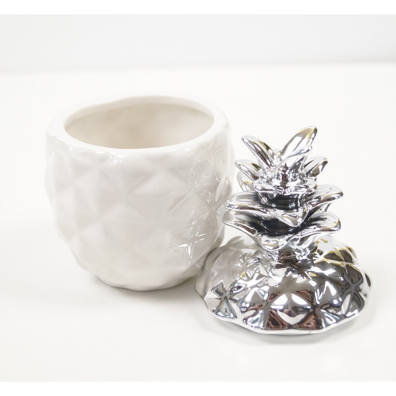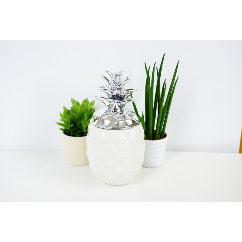 Ornamental pineapple in a modern silver finish. Made from white Ceramic with high silver glaz. A chic and unique decorative home accessory.