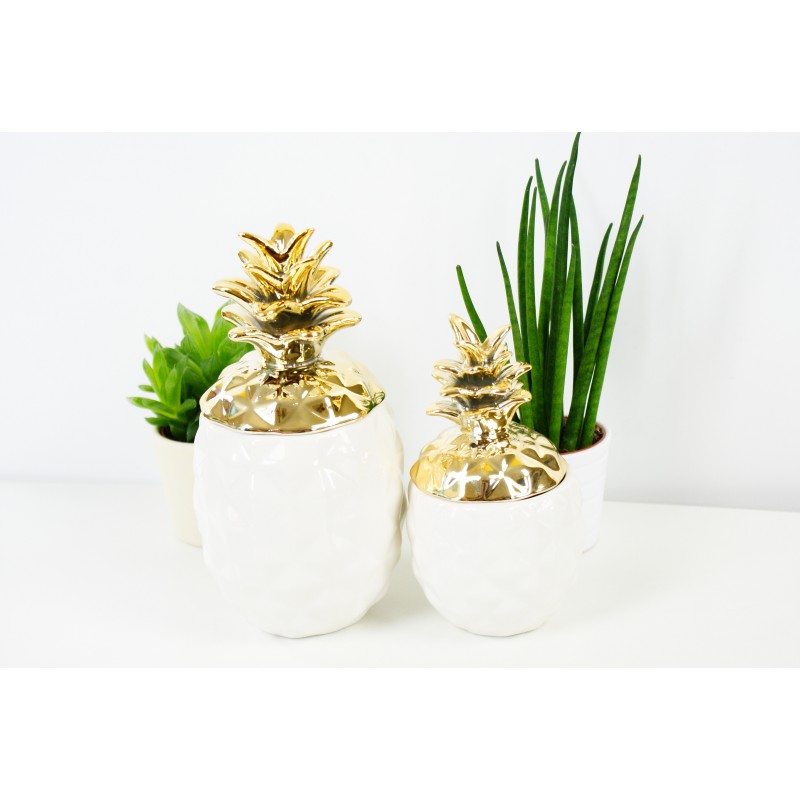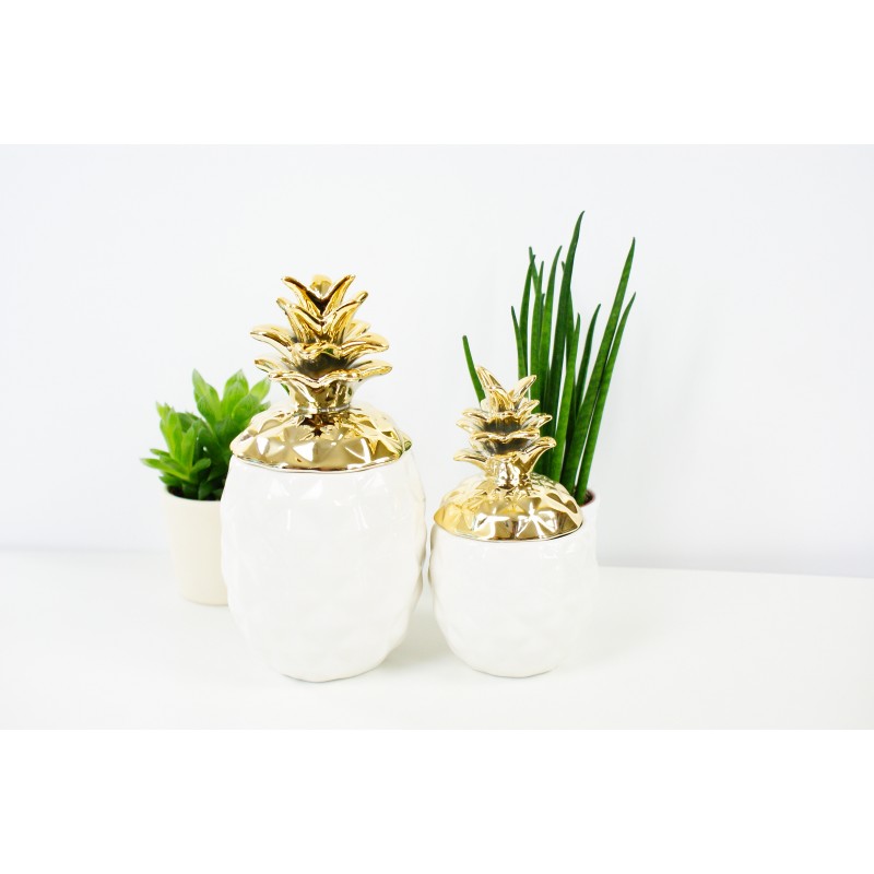 Ornamental pineapple in a modern Gold finish. Made from white Ceramic with high silver glaz. A chic and unique decorative home accessory.