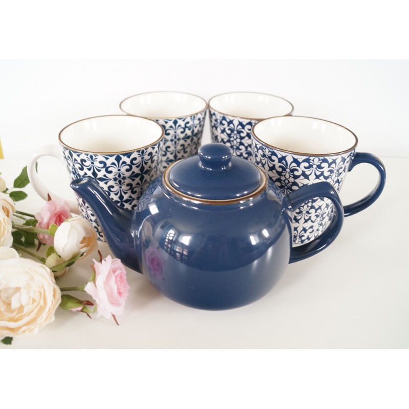 Stylish blue and white mugs and blue teapot. It's the perfect addition to your favourite meals. It's also dishwasher and microwave safe for added convenience.